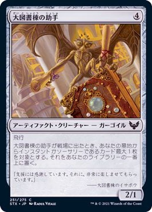 飛行大図書棟の助手が戦場に出たとき、あなたの墓地からインスタントかソーサリーであるカード最大1枚を対象とする。それをあなたのライブラリーの一番上に置く。